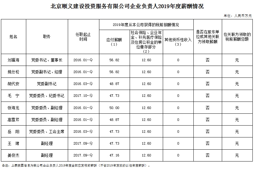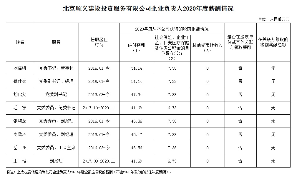 北京順義建設投資服務有限公司企業(yè)負責人2020年度薪酬信息披露
