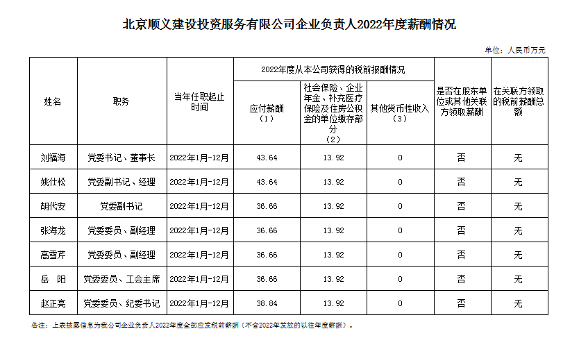 北京順義建設投資服務有限公司企業(yè)負責人2022年度薪酬信息披露